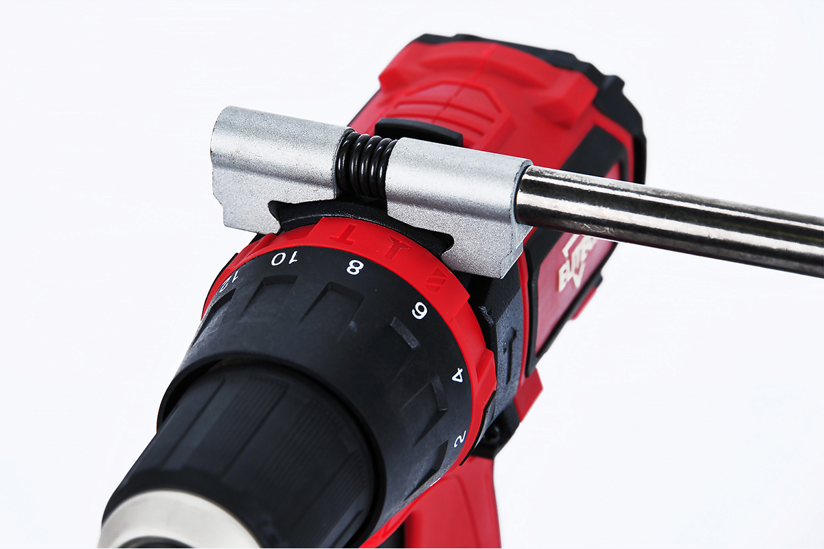 Дрель имеет две скорости (0-500 и 0-2000 об/мин), реверс, муфту ограничения крутящего момента с 25-ю положениями и возможностью отключения (для режима сверления). Патрон бесключевой, одномуфтовый, с диапазоном зажима от 2 до 13 мм. Для управления патроном одной рукой дрель имеет автоматическую блокировку шпинделя. Эргономичная рукоятка имеет накладки для предотвращения проскальзывания в руке. Резиновые вставки на корпусе удерживают инструмент на наклонной плоскости и защищают поверхность, на которую кладут дрель, от возможного повреждения корпусом дрели. Имеется светодиодная подсветка, скоба подвеса на ремень и индикатор уровня заряда аккумулятора (на корпусе дрели). Шестерни в редукторе выполнены из стали. Выходной вал на двух разнесенных подшипниках.