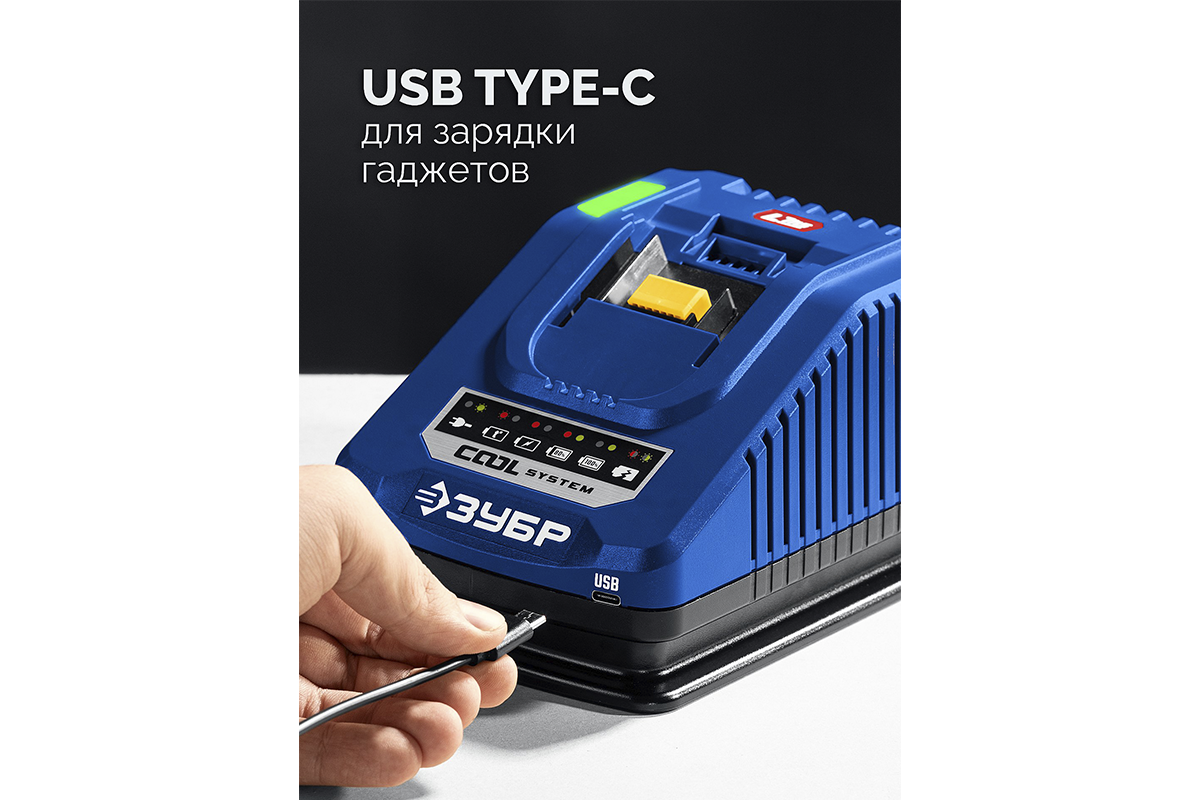 - Высокотоковое зарядное устройство с принудительным охлаждением для быстрой зарядки аккумулятора. Включает порт USB-type C, что позволяет заряжать носимые устройства