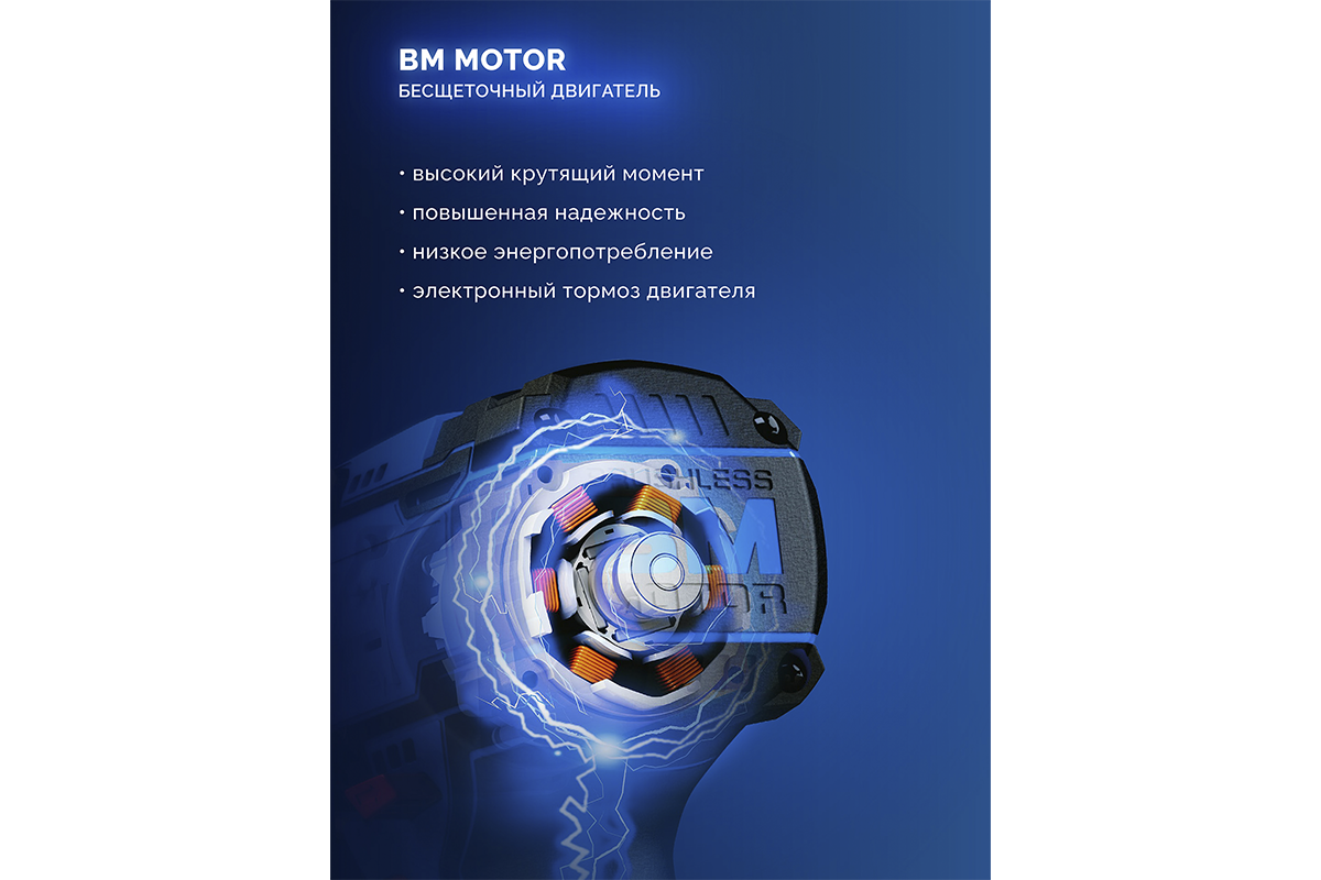 - Бесщеточный BM-Motor двигатель обладает рядом преимуществ по сравнению с щеточным двигателем: - высокий крутящий момент, - высокий КПД благодаря максимально эффективному преобразованию электромагнитной энергии в механическую (ввиду отсутствия перекоммутаций), - повышенная надежность ввиду отсутствия искрения, трения и трущихся деталей,