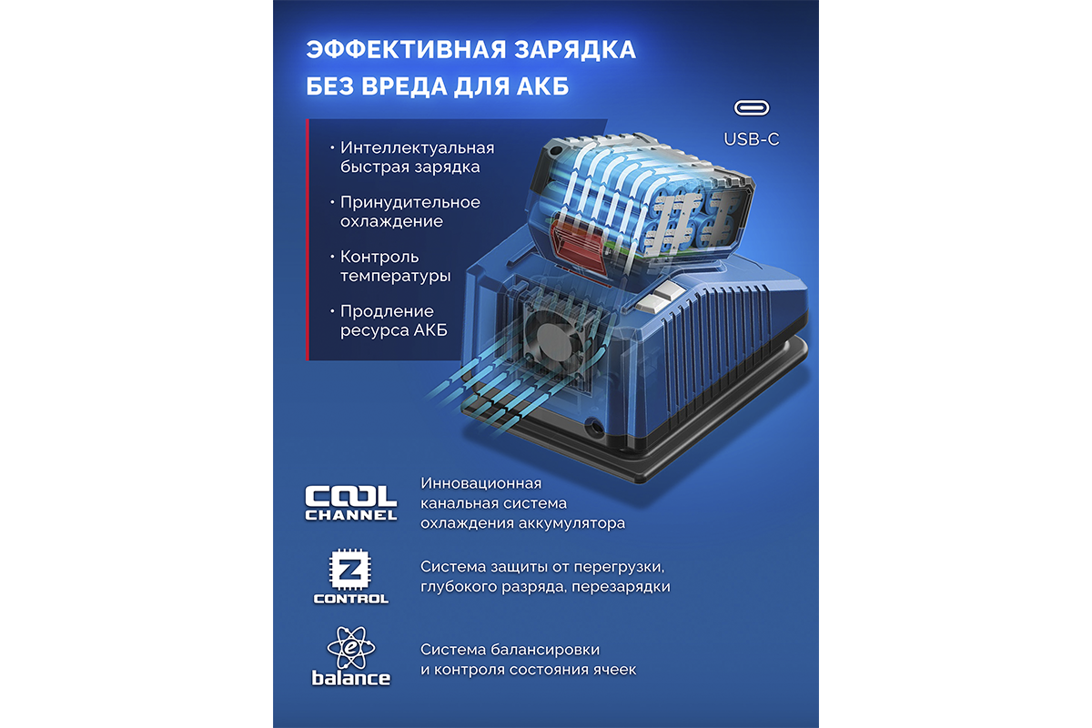 - Высокотоковое зарядное устройство с принудительным охлаждением для быстрой зарядки аккумулятора. Включает порт USB-type C, что позволяет заряжать носимые устройства