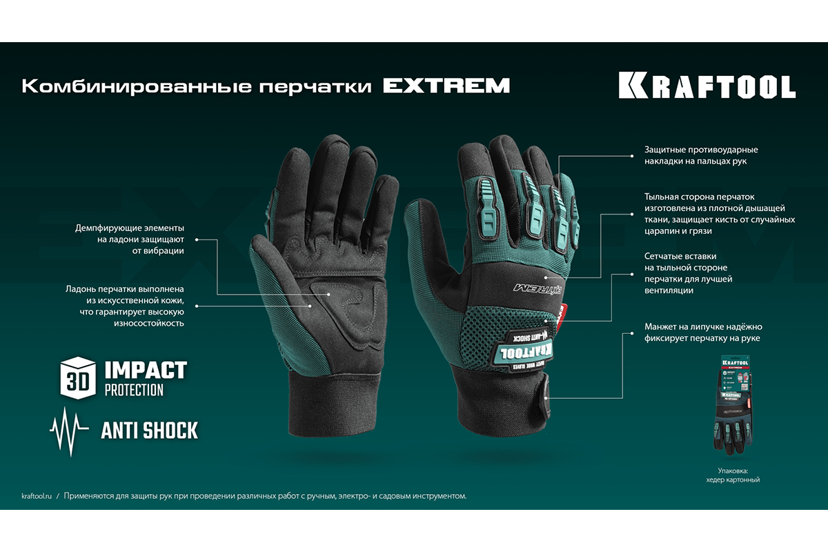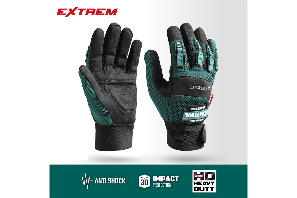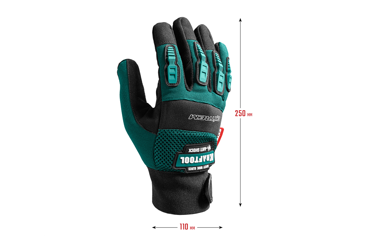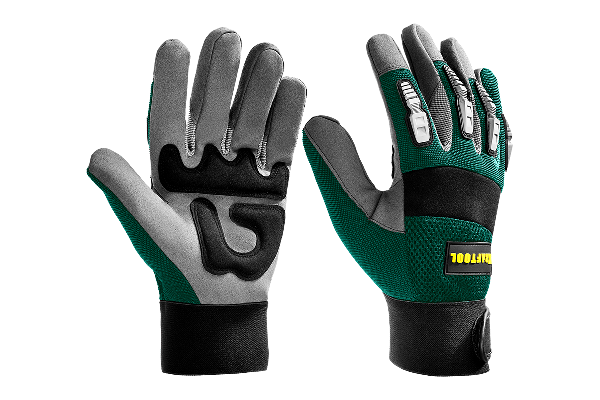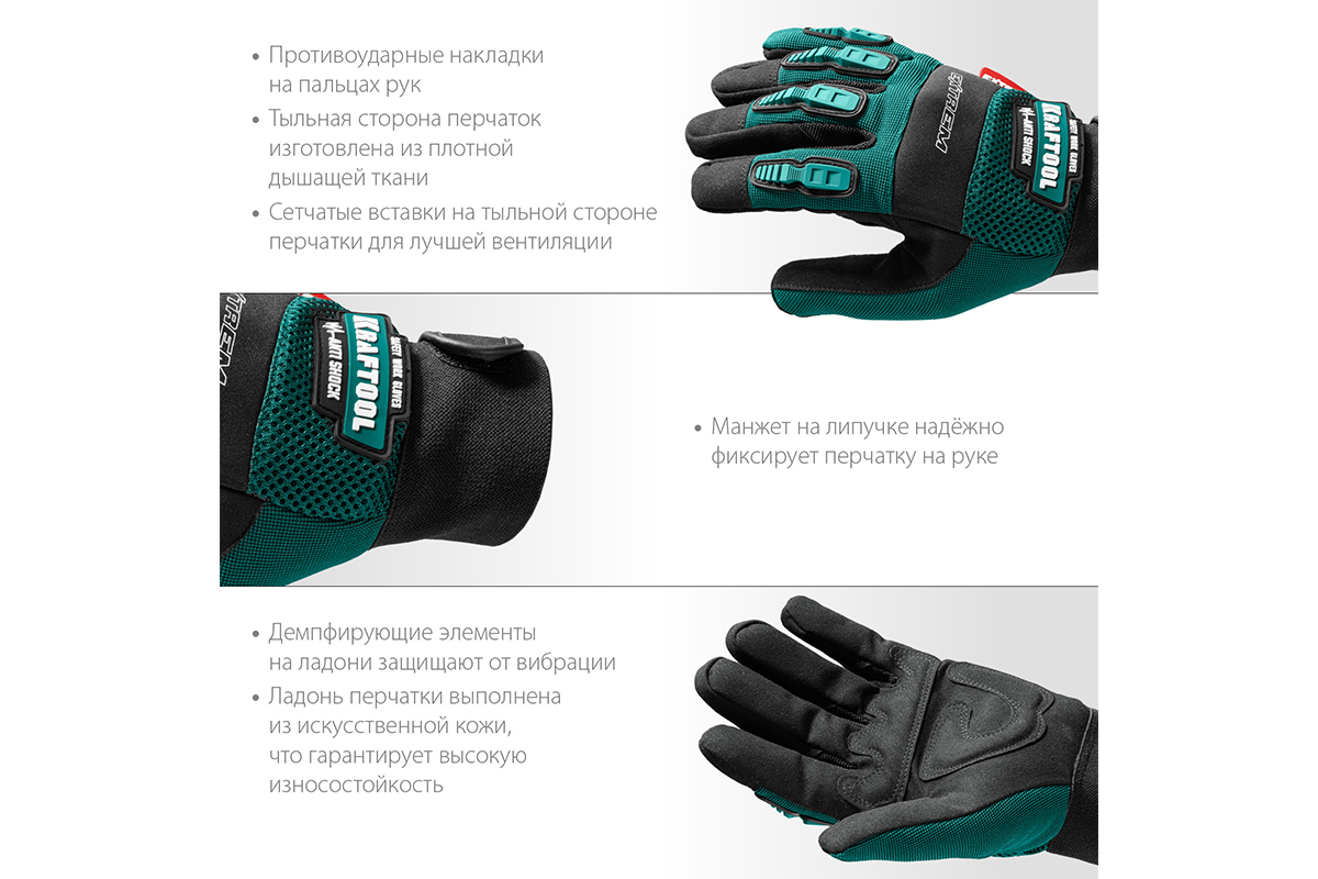 Перчатки рабочие KRAFTOOL 11287-L, предназначены для защиты рук при проведении различных работ с ручным, электро- и садовым инструментом. Демпфирующие элементы на ладони защищают от вибрации. Многослойная сетчатая вставка на тыльной стороне ладони создает отличную воздухопроницаемость. Двойные плоские швы и анатомическая форма перчаток способствуют повышенному комфорту при выполнении работ. Накладки из термопластичной резины защищают от ударов пальцы. Эластичная манжета с застежкой-липучкой надежно фиксирует перчатки на руках.