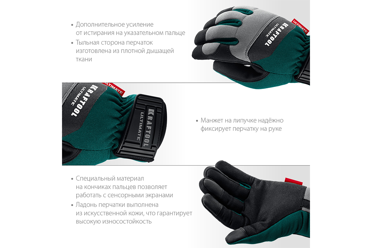 Перчатки рабочие KRAFTOOL 11299-L, предназначены для защиты рук при проведении различных работ с ручным, электро- и садовым инструментом. Специальный материал на кончиках пальцев позволяет работать с сенсорными экранами. Ладонь перчатки выполнена из искусственной кожи, что гарантирует высокую износостойкость. Дополнительное усиление от истирания на указательном пальце. Манжет на липучке надежно фиксирует перчатку на руке.
